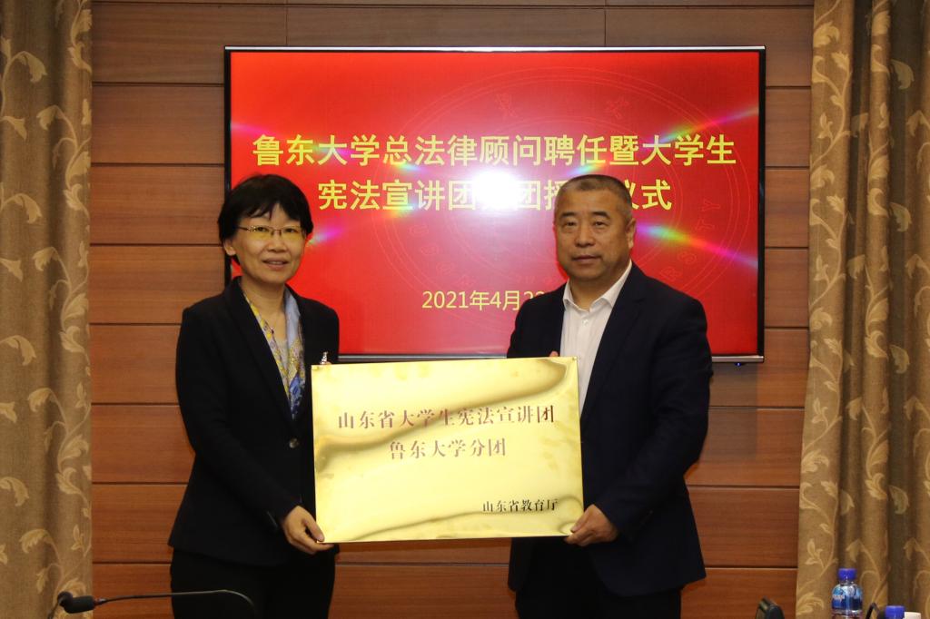 4月22日上午,山东省大学生宪法宣讲团鲁东大学分团成立仪式在学术中心厚德厅举行,校党委常委、副校长钱国旗教授主持仪式,hg6999皇冠官网部分教师、山东省大学生宪法宣讲团鲁东大学分团代表参加仪式。仪式上,山东省教育厅副厅长孙晓筠为山东省大学生宪法宣讲团鲁东大学分团授牌,hg6999皇冠官网执行院长孙明接牌,山东省大学生宪法宣讲团鲁东大学分团代表、hg6999皇冠官网秦永梅作为学生代表发言。